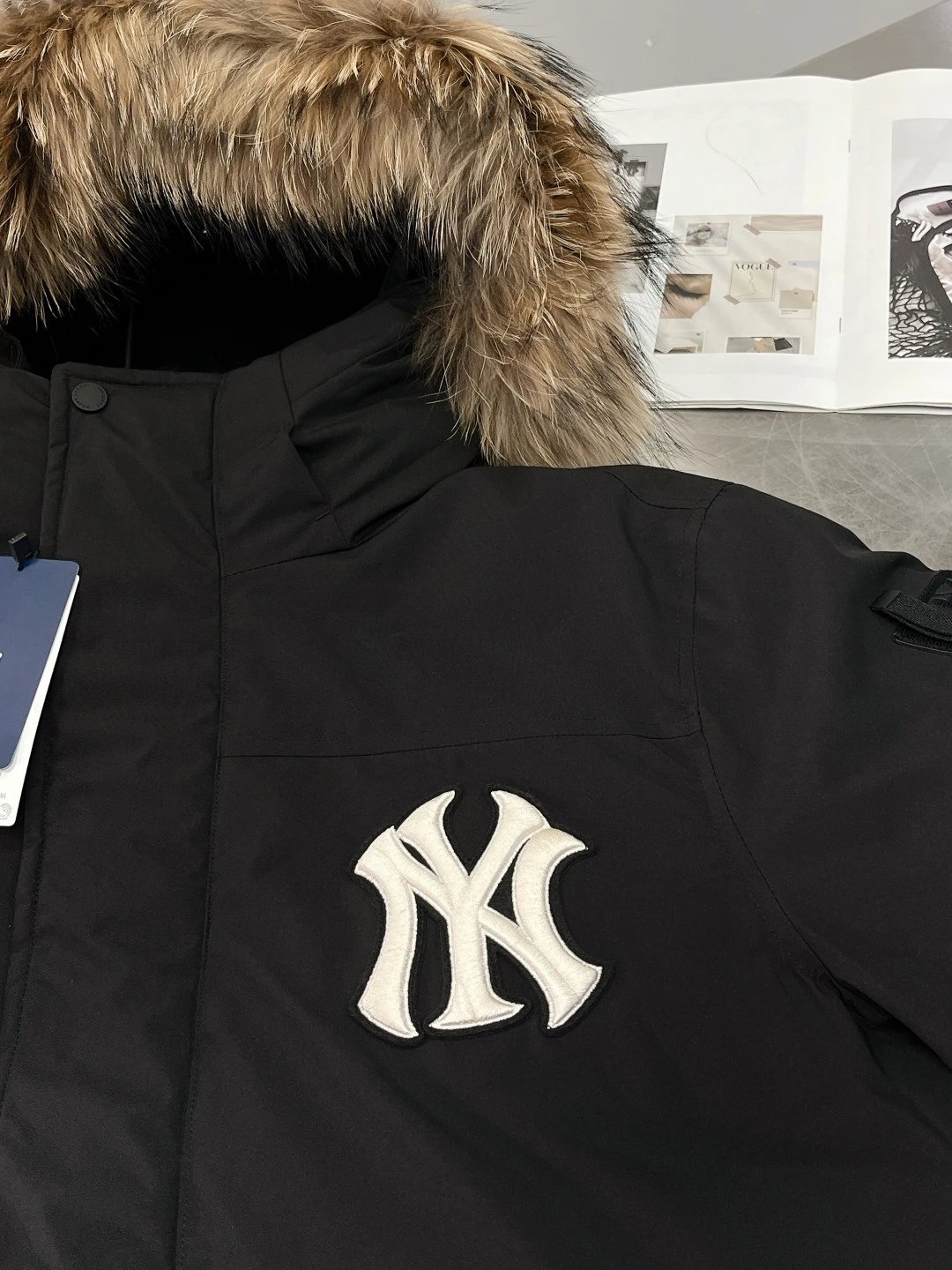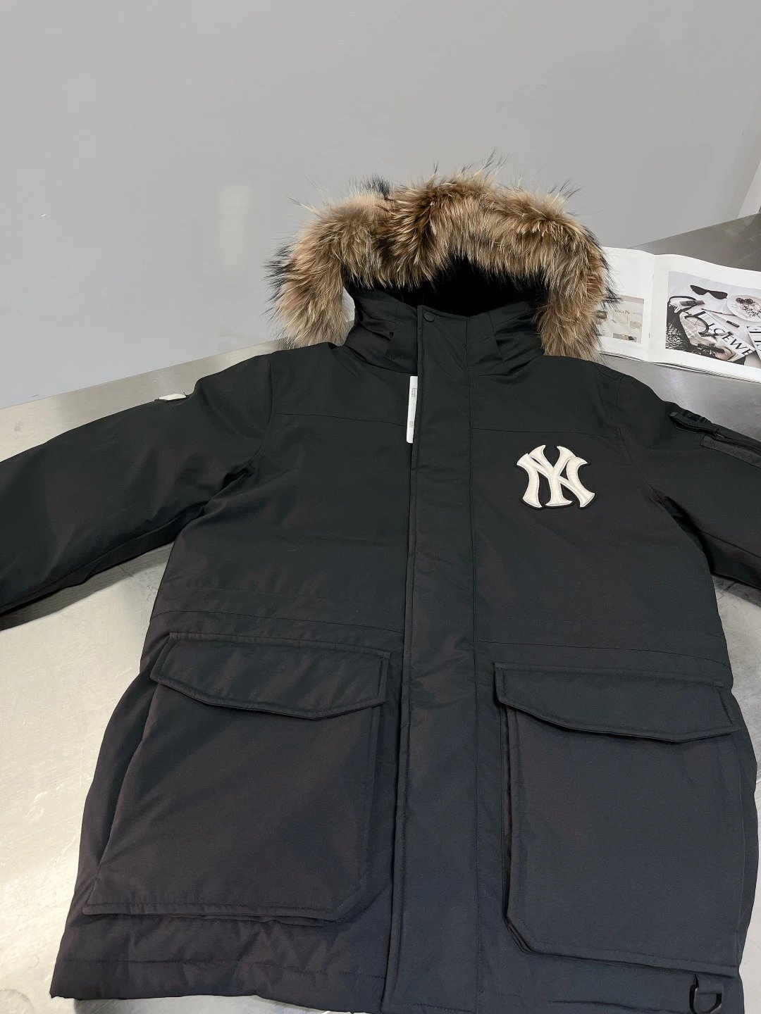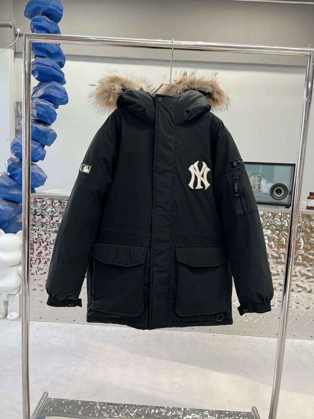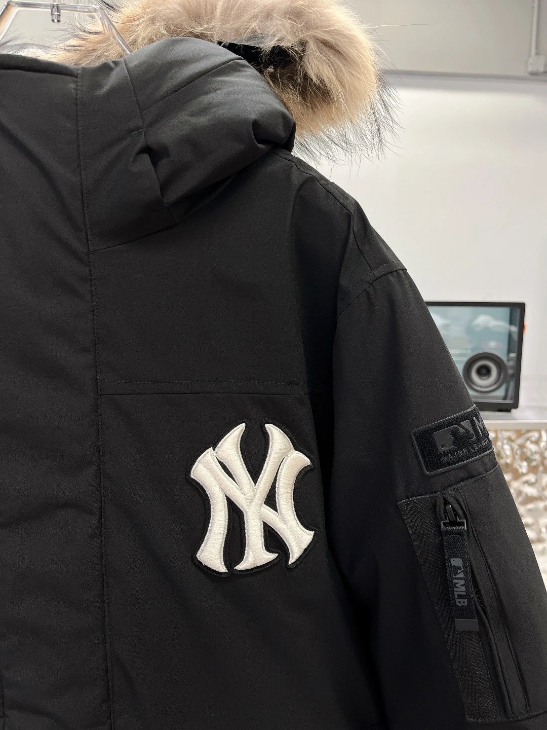 / MLB New York Yankees Oversized Logo Hooded Long Puffer Jacket Black